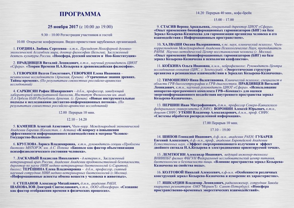 25 ноября 2017 года в конференц-зале Московской торгово-промышленной палаты прошла 2-я Международная научно-практическая конференция по теме:«Теория времени астрофизика Н.А. Козырева и взаимодействие с информационным пространством»,организованная Центром интегральных оздоровительных технологий «Сфера».