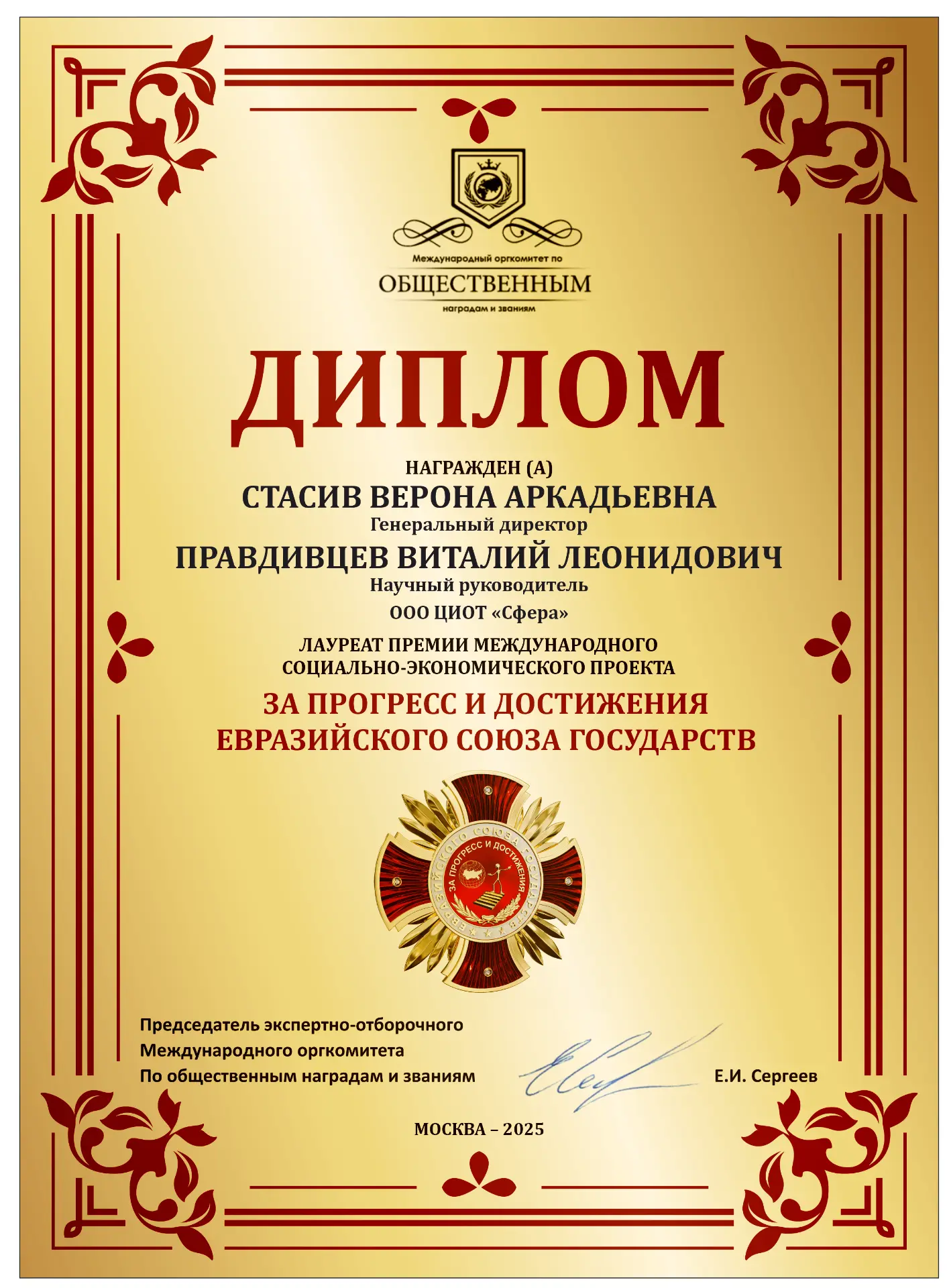 Награда — золотой орден «ЗА ТРУД И ДОБЛЕСТЬ Евразийского Союза Государств»